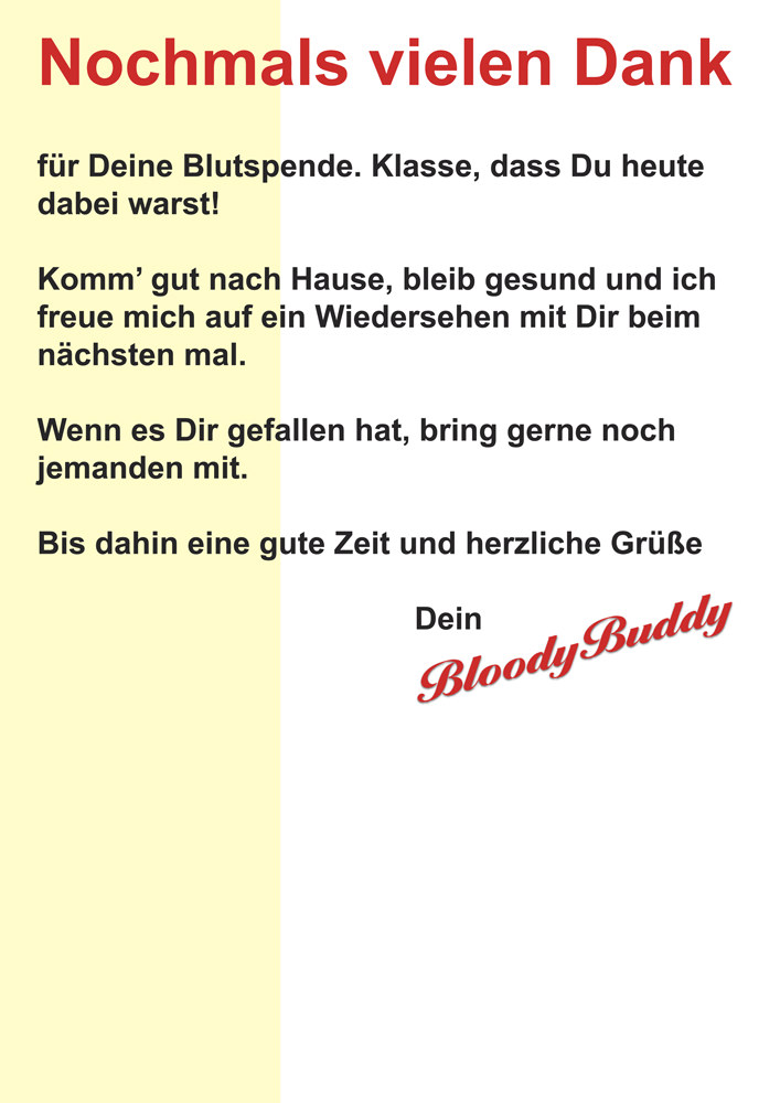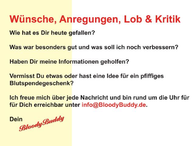 Eigene Ideen, wie ich Dich noch unterstützen kann? Schreib mit gerne eine Email unter info@bloodybuddy.de erreichst Du mich. Ich freue mich über jede Anregung!
