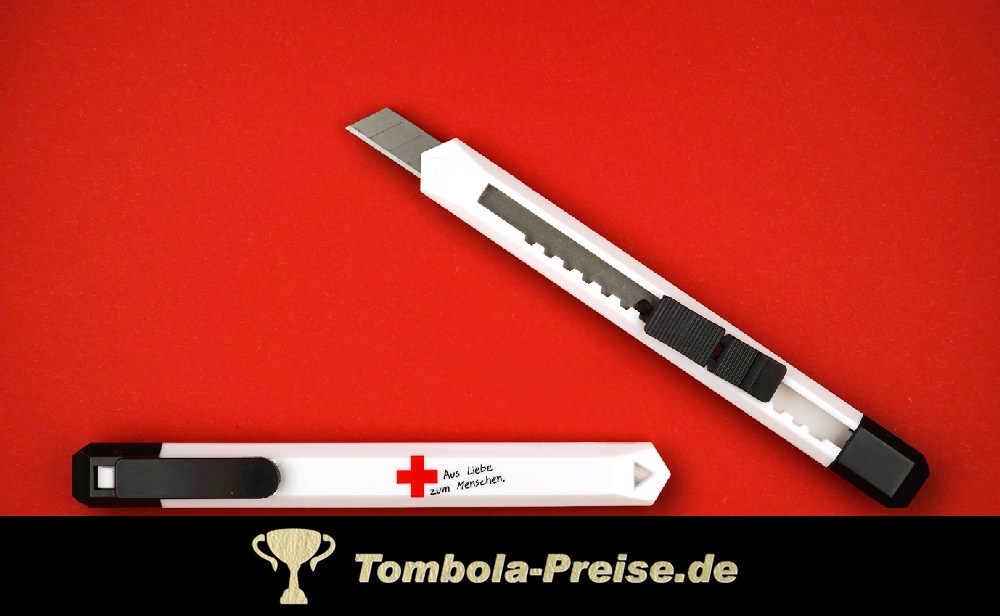 Der Kartonschneider bzw. das Teppichmesser ist 16 cm lang, aus weißem Kunststoff gefertigt und mit einem Kreuz / Pluszeichen bedruckt. Optional in Geschenkverpackung und mit persönlicher Lasergravur erhältlich.